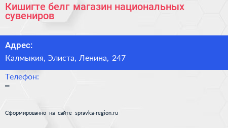 Кишигте белг, магазин национальных сувениров по адресу Калмыкия, Элиста, Ленина, 247 в дальнейшем Организация, размещена в следующих категориях: