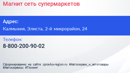 Магнит, сеть супермаркетов по адресу Калмыкия, Элиста, 2-й микрорайон, 24 в дальнейшем Организация, размещена в следующих категориях: