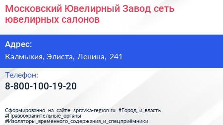 Московский Ювелирный Завод, сеть ювелирных салонов по адресу Калмыкия, Элиста, Ленина, 241 в дальнейшем Организация, размещена в следующих категориях:
