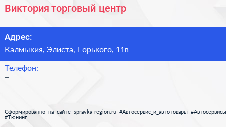Виктория, торговый центр по адресу Калмыкия, Элиста, Горького, 11в в дальнейшем Организация, размещена в следующих категориях:
