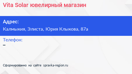 Vita Solar, ювелирный магазин по адресу Калмыкия, Элиста, Юрия Клыкова, 87а в дальнейшем Организация, размещена в следующих категориях: