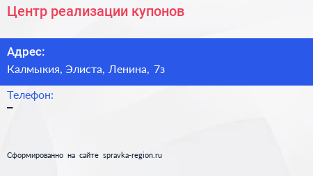 Центр реализации купонов по адресу Калмыкия, Элиста, Ленина, 7з в дальнейшем Организация, размещена в следующих категориях: