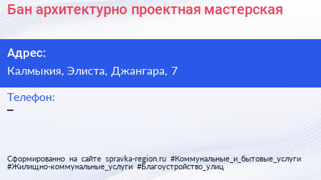 Бан, архитектурно-проектная мастерская по адресу Калмыкия, Элиста, Джангара, 7 в дальнейшем Организация, размещена в следующих категориях: