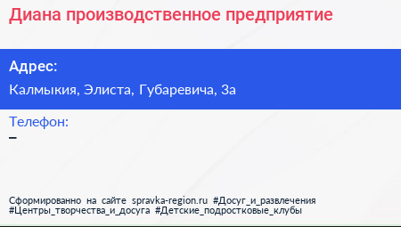 Диана, производственное предприятие по адресу Калмыкия, Элиста, Губаревича, 3а в дальнейшем Организация, размещена в следующих категориях: