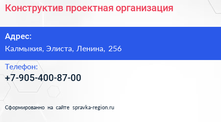 Конструктив, проектная организация по адресу Калмыкия, Элиста, Ленина, 256 в дальнейшем Организация, размещена в следующих категориях: