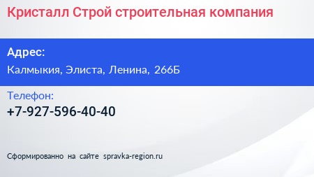 Кристалл-Строй, строительная компания по адресу Калмыкия, Элиста, Ленина, 266Б в дальнейшем Организация, размещена в следующих категориях: