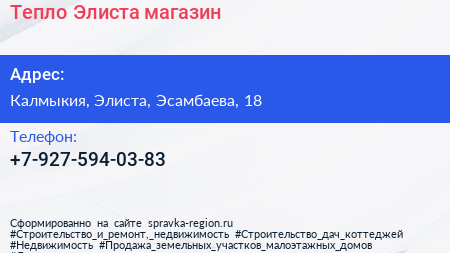 Тепло Элиста, магазин по адресу Калмыкия, Элиста, Эсамбаева, 18 в дальнейшем Организация, размещена в следующих категориях: