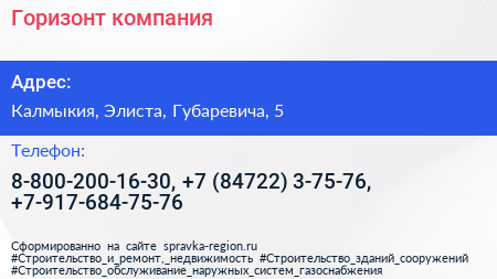Горизонт, компания по адресу Калмыкия, Элиста, Губаревича, 5 в дальнейшем Организация, размещена в следующих категориях: