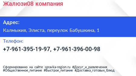 Жалюзи08, компания по адресу Калмыкия, Элиста, переулок Бабушкина, 1 в дальнейшем Организация, размещена в следующих категориях: