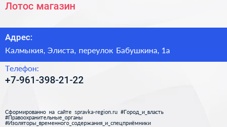 Лотос, магазин по адресу Калмыкия, Элиста, переулок Бабушкина, 1а в дальнейшем Организация, размещена в следующих категориях: