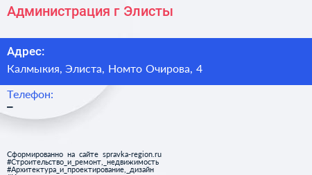 Администрация г. Элисты по адресу Калмыкия, Элиста, Номто Очирова, 4 в дальнейшем Организация, размещена в следующих категориях: