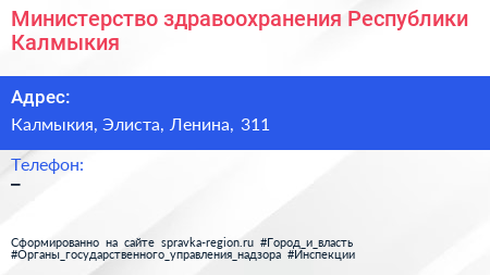Министерство здравоохранения Республики Калмыкия по адресу Калмыкия, Элиста, Ленина, 311 в дальнейшем Организация, размещена в следующих категориях: