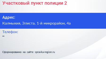 Участковый пункт полиции №2 по адресу Калмыкия, Элиста, 1-й микрорайон, 4а в дальнейшем Организация, размещена в следующих категориях: