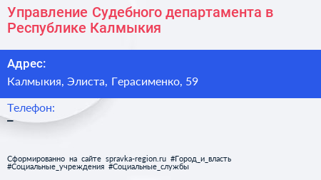 Управление Судебного департамента в Республике Калмыкия по адресу Калмыкия, Элиста, Герасименко, 59 в дальнейшем Организация, размещена в следующих категориях: