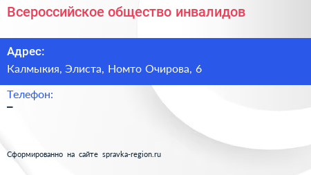 Всероссийское общество инвалидов по адресу Калмыкия, Элиста, Номто Очирова, 6 в дальнейшем Организация, размещена в следующих категориях:
