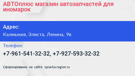 АВТОплюс, магазин автозапчастей для иномарок по адресу Калмыкия, Элиста, Ленина, 9в в дальнейшем Организация, размещена в следующих категориях: