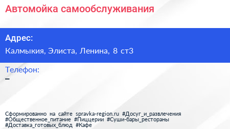 Автомойка самообслуживания по адресу Калмыкия, Элиста, Ленина, 8 ст3 в дальнейшем Организация, размещена в следующих категориях: