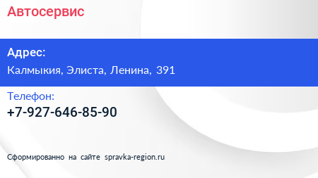Автосервис по адресу Калмыкия, Элиста, Ленина, 391 в дальнейшем Организация, размещена в следующих категориях: