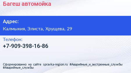 Багеш, автомойка по адресу Калмыкия, Элиста, Хрущева, 29 в дальнейшем Организация, размещена в следующих категориях: