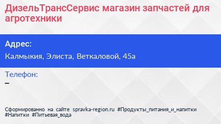 ДизельТрансСервис, магазин запчастей для агротехники по адресу Калмыкия, Элиста, Веткаловой, 45а в дальнейшем Организация, размещена в следующих категориях:
