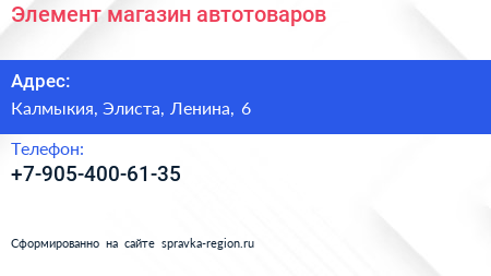 Элемент, магазин автотоваров по адресу Калмыкия, Элиста, Ленина, 6 в дальнейшем Организация, размещена в следующих категориях: