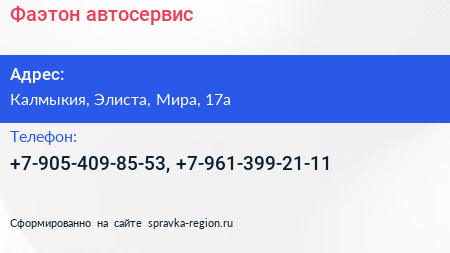 Фаэтон, автосервис по адресу Калмыкия, Элиста, Мира, 17а в дальнейшем Организация, размещена в следующих категориях: