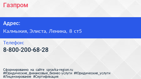 Газпром по адресу Калмыкия, Элиста, Ленина, 8 ст5 в дальнейшем Организация, размещена в следующих категориях: