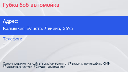 Губка боб, автомойка по адресу Калмыкия, Элиста, Ленина, 369а в дальнейшем Организация, размещена в следующих категориях: