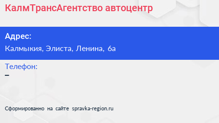 КалмТрансАгентство, автоцентр по адресу Калмыкия, Элиста, Ленина, 6а в дальнейшем Организация, размещена в следующих категориях: