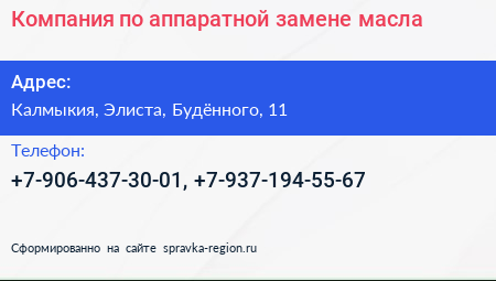 Компания по аппаратной замене масла по адресу Калмыкия, Элиста, Будённого, 11 в дальнейшем Организация, размещена в следующих категориях: