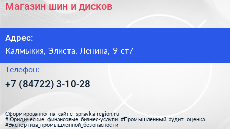 Магазин шин и дисков по адресу Калмыкия, Элиста, Ленина, 9 ст7 в дальнейшем Организация, размещена в следующих категориях: