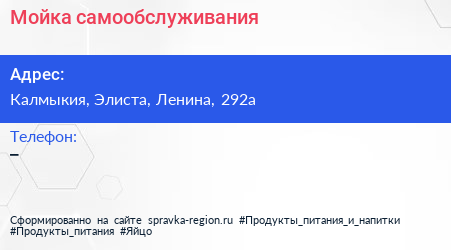 Мойка самообслуживания по адресу Калмыкия, Элиста, Ленина, 292а в дальнейшем Организация, размещена в следующих категориях: