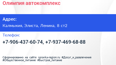 Олимпия, автокомплекс по адресу Калмыкия, Элиста, Ленина, 8 ст2 в дальнейшем Организация, размещена в следующих категориях: