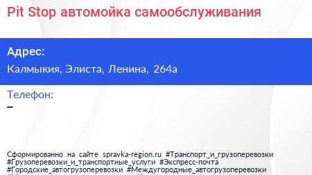 Pit Stop, автомойка самообслуживания по адресу Калмыкия, Элиста, Ленина, 264а в дальнейшем Организация, размещена в следующих категориях: