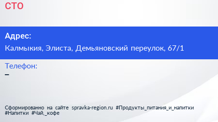 СТО по адресу Калмыкия, Элиста, Демьяновский переулок, 67/1 в дальнейшем Организация, размещена в следующих категориях: