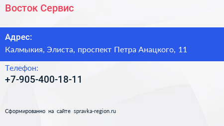 Восток Сервис по адресу Калмыкия, Элиста, проспект Петра Анацкого, 11 в дальнейшем Организация, размещена в следующих категориях: