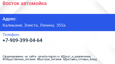 Восток, автомойка по адресу Калмыкия, Элиста, Ленина, 355а в дальнейшем Организация, размещена в следующих категориях: