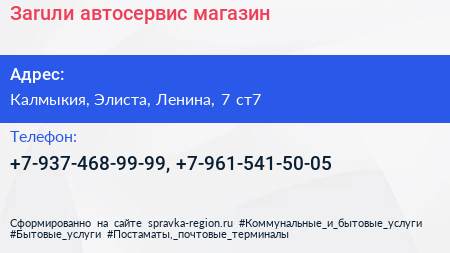 Заruли, автосервис-магазин по адресу Калмыкия, Элиста, Ленина, 7 ст7 в дальнейшем Организация, размещена в следующих категориях: