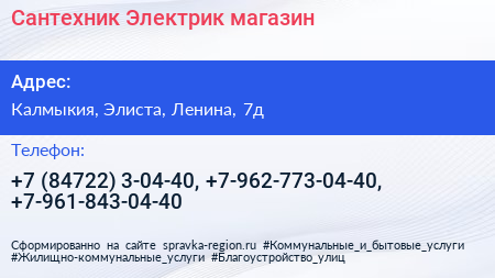 Сантехник-Электрик, магазин по адресу Калмыкия, Элиста, Ленина, 7д в дальнейшем Организация, размещена в следующих категориях: