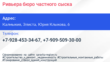 Ривьера, бюро частного сыска по адресу Калмыкия, Элиста, Юрия Клыкова, 6 в дальнейшем Организация, размещена в следующих категориях: