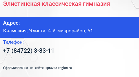 Элистинская классическая гимназия по адресу Калмыкия, Элиста, 4-й микрорайон, 51 в дальнейшем Организация, размещена в следующих категориях: