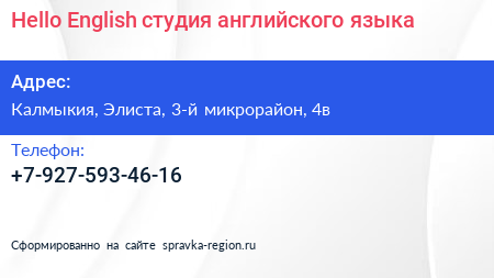 Hello, English!, студия английского языка по адресу Калмыкия, Элиста, 3-й микрорайон, 4в в дальнейшем Организация, размещена в следующих категориях:
