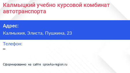 Калмыцкий учебно-курсовой комбинат автотранспорта по адресу Калмыкия, Элиста, Пушкина, 23 в дальнейшем Организация, размещена в следующих категориях: