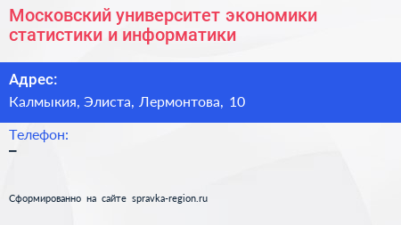 Московский университет экономики, статистики и информатики по адресу Калмыкия, Элиста, Лермонтова, 10 в дальнейшем Организация, размещена в следующих категориях: