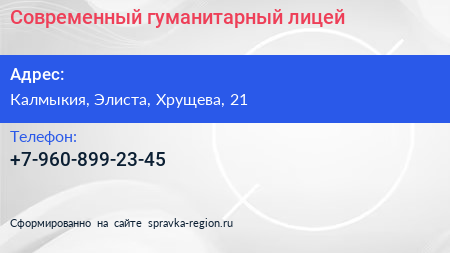 Современный гуманитарный лицей по адресу Калмыкия, Элиста, Хрущева, 21 в дальнейшем Организация, размещена в следующих категориях: