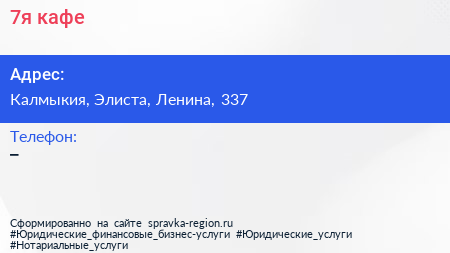 7я, кафе по адресу Калмыкия, Элиста, Ленина, 337 в дальнейшем Организация, размещена в следующих категориях: