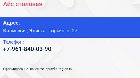 Айс, столовая по адресу Калмыкия, Элиста, Горького, 27 в дальнейшем Организация, размещена в следующих категориях: