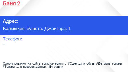 Баня №2 по адресу Калмыкия, Элиста, Джангара, 1 в дальнейшем Организация, размещена в следующих категориях: