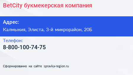 BetCity, букмекерская компания по адресу Калмыкия, Элиста, 3-й микрорайон, 20Б в дальнейшем Организация, размещена в следующих категориях: