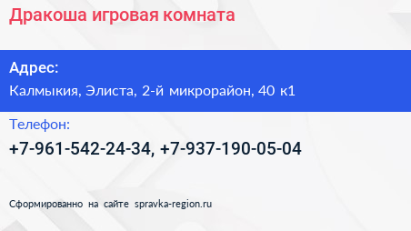 Дракоша, игровая комната по адресу Калмыкия, Элиста, 2-й микрорайон, 40 к1 в дальнейшем Организация, размещена в следующих категориях: